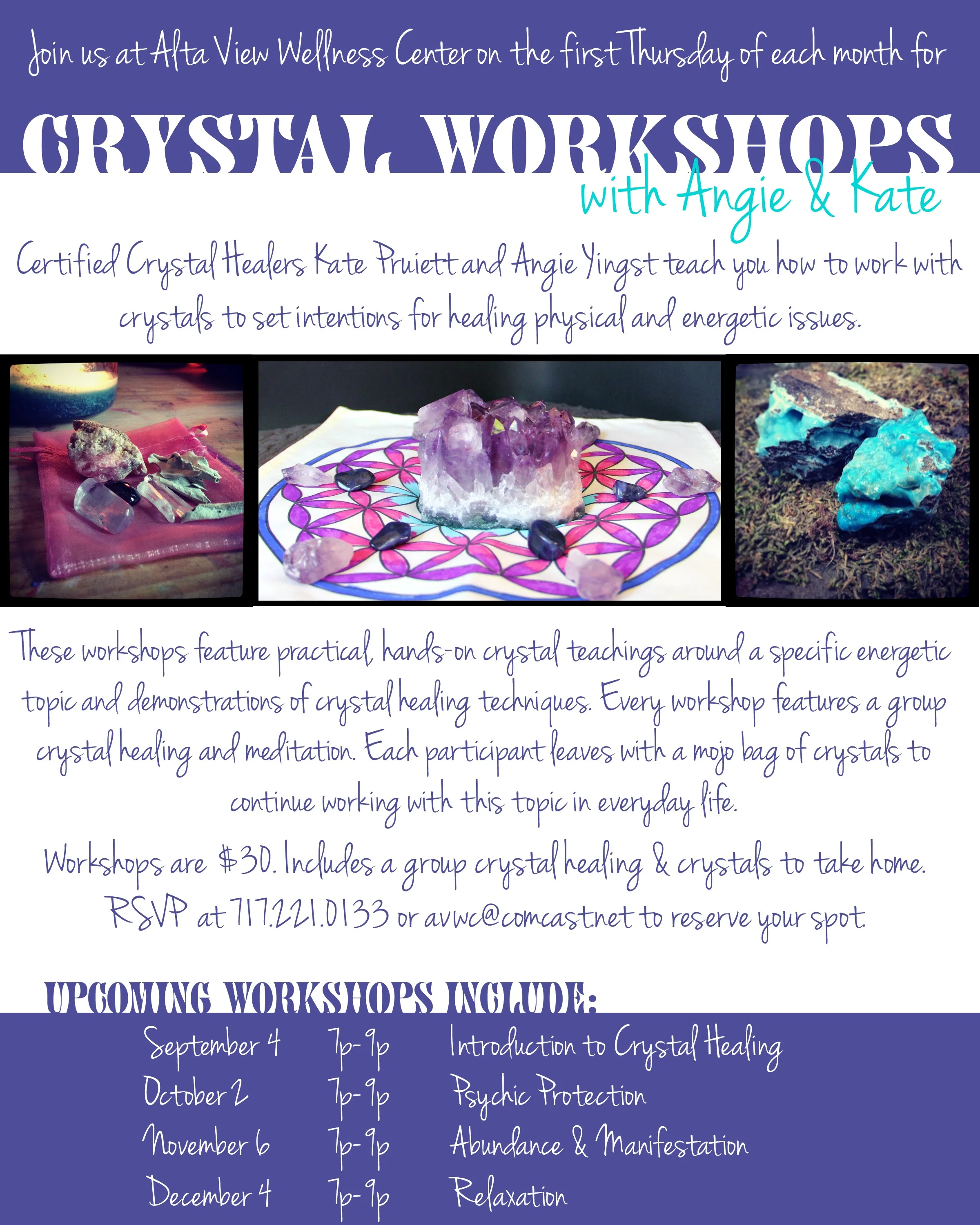 Each month, Certified Crystal Healers, Kate Pruiett and Angie Yingst gather at Alta View to cover a crystal healing topic. In October, we are covering psychic protection and some crystal healing ways to protect and strengthen your EMF. We will cover grounding, energetic protection, crystal healing techniques and other topics. Each workshop includes a group crystal healing around that topic, and each participant leaves with a mojo bag of crystals to continue this work. $30. To attend this circle, please contact call Alta View at 717-221-0133 or contact me at themoonandstone@gmail.com