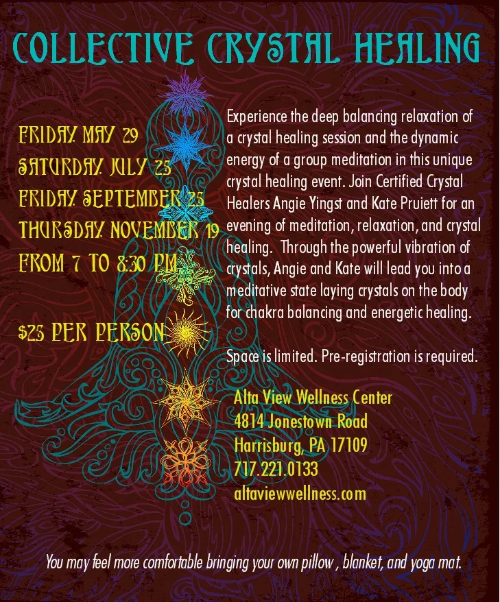 Experience the deep balancing relaxation of a crystal healing session and the dynamic energy of a group meditation in this unique crystal healing event. Join Certified Crystal Healer Angie Yingst for an evening of meditation, relaxation, and crystal healing. Through the powerful vibration of crystals, Angie will lead you into a meditative state laying crystals on the body for chakra balancing and energetic healing. You may feel more comfortable bringing your own pillow , blanket, and yoga mat.