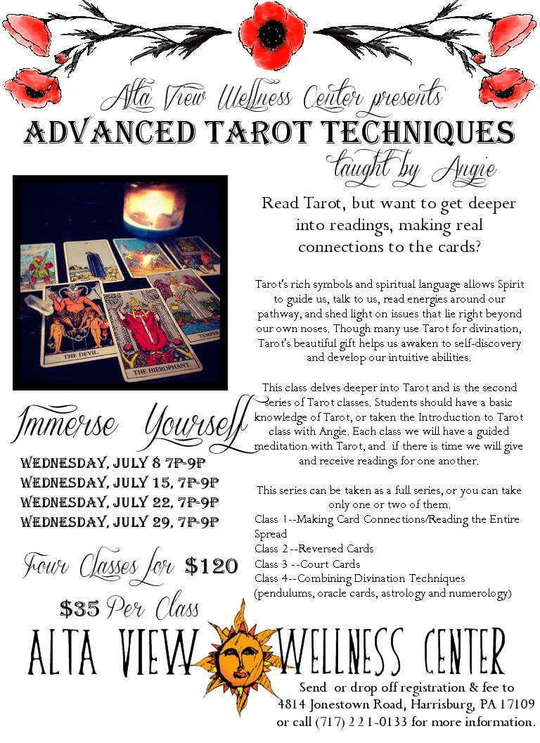 This class delves deeper into Tarot and is the second series of Tarot classes. Students should have a basic knowledge of Tarot, or taken the Introduction to Tarot class with Angie. Each class we will have a guided meditation with Tarot, and if there is time we will give and receive readings for one another.