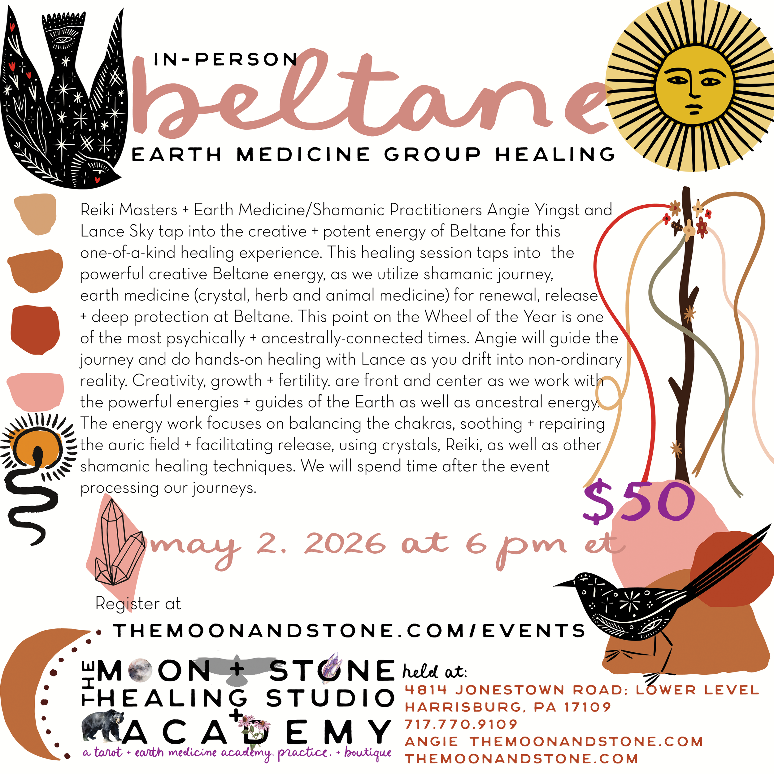 in-person beltane shamanic journey + healing Saturday, May 2, 2026 6:00 PM 8:00 PM 18:00 20:00 The Moon + Stone Healing 4814 Jonestown Road, Lower Level Harrisburg, PA 17109 United States (map) Google Calendar ICS